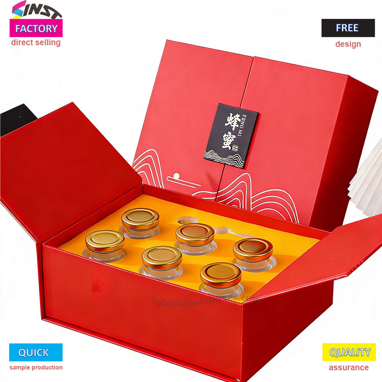 Kothak hadiah madu abang iki nggabungake pola gelombang sing elegan karo kardus keras berkualitas tinggi, kanthi struktur sing bisa dilipat kanggo panyimpenan lan transportasi sing gampang. Kothak hadiah madu ndhukung macem-macem ukuran jar kaca (kanggo madu / tonik) lan dilengkapi karo sisipan busa khusus kanggo nahan isi. Cocog banget kanggo hadiah liburan, hadiah bisnis, lan kemasan produk kesehatan, konsisten karo pilihan hadiah ing pasar Eropa, Amerika, lan Asia Tenggara. Kothak iki entheng, apik gayane, lan larang regane nalika nambah nilai produk.