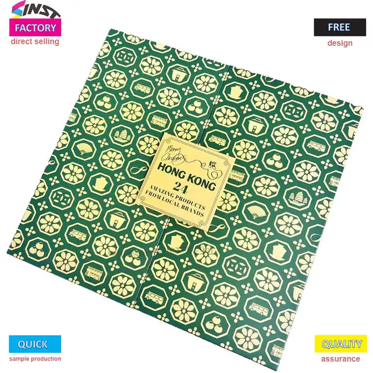 Kothak Hadiah Tanggalan Advent iki nduweni desain countdown liburan kanthi 24 laci lan 1 kompartemen khusus, kanthi sampurna mulihake rasa upacara unboxing Natal. Cocog kanggo macem-macem produk kayata coklat, conto kaendahan, lan aksesoris cilik; Latar mburi ijo jero dipasangake karo printing foil emas, dilengkapi karo skyline kutha lan pola lintang, ora mung exudes tektur dhuwur-mburi nanging uga exudes swasana perayaan, nggawe tampilan rak banget atraktif.