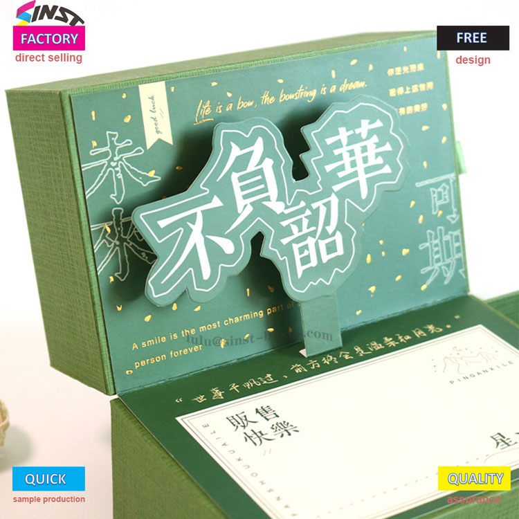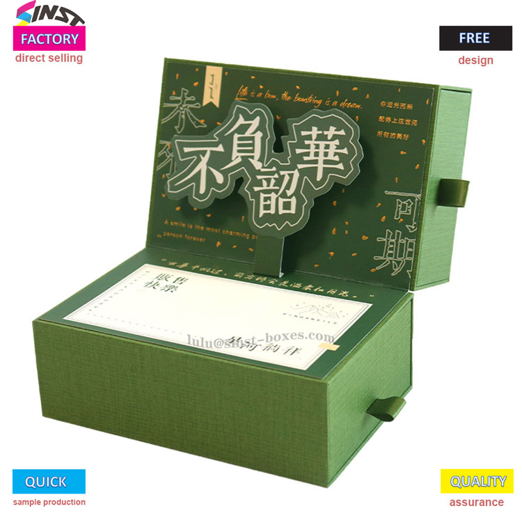 Kothak hadiah parfum iki, sing langsung didol dening kemasan lan percetakan SINST, njupuk ijo seger minangka nada utama. Awak kothak jinis laci dilengkapi karakter seni telung dimensi lan dekorasi emas. Sisih kothak hadiah Parfum dihiasi karo "Shao" lan "Qi", lan alur bantal internal stabil lan wangi, nuduhake delicacy. Koeksistensi rasa seni lan rasa ritual minangka pilihan kualitas kanggo ngirim emosi.