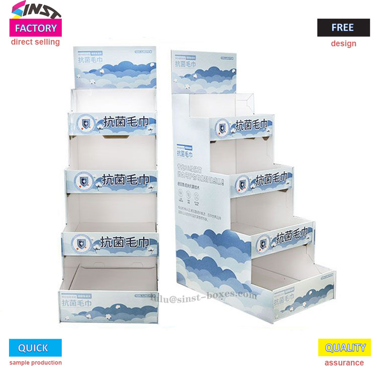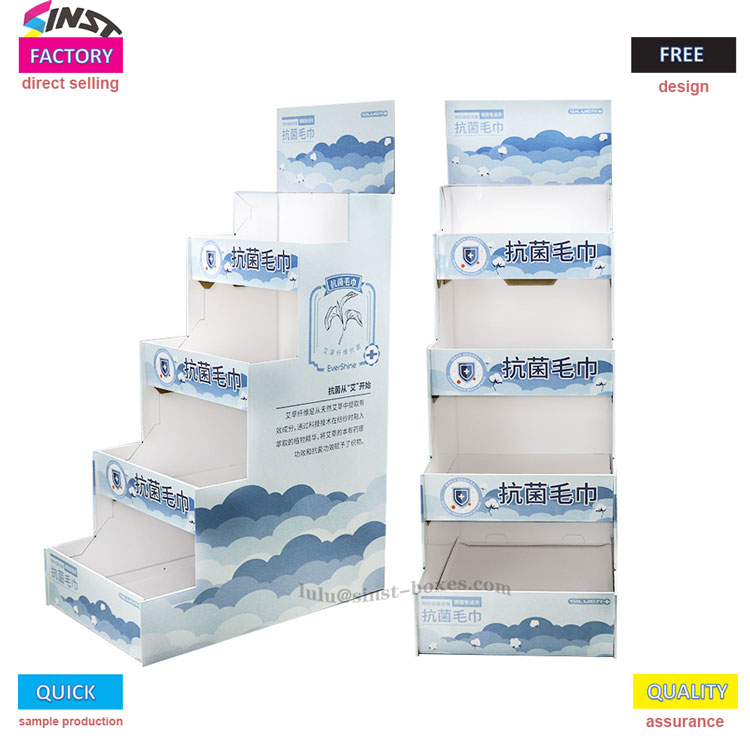 Rak towal karton sing tebal iki kanthi becik nyukupi kabutuhan skenario konsumen cepet kayata supermarket, Toko penipuan, lan toko kaendahan. Struktur sing mandheg saka rak tampilan anolone kaya "kothak panyimpenan berlapis", sing bisa dadi tong spesifikasi sing beda kayata jaringan, ances portebel, etc. Kertu promosi ing sisih ndhuwur bisa dipasangake karo fitur kayata "sertifikasi ibu lan bayi" lan "ngeculake" kanggo ngidini andhuk kanggo ngidini andhuk.